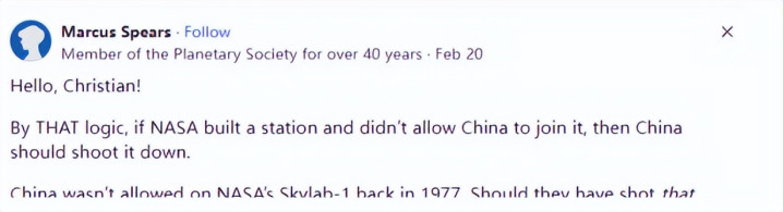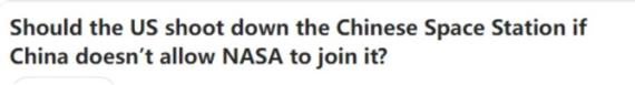 有人大放厥词,声称“若中国禁止美加入中国空间站,美国有权将其击落”。
