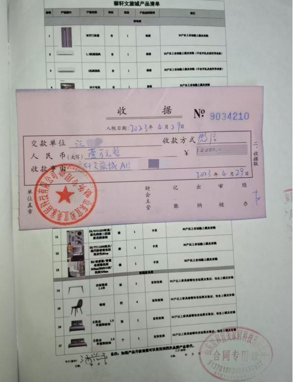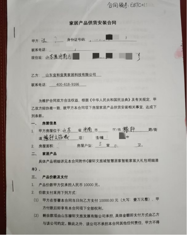 2023年4月,汪先生购置了山东稼轩文旅发展有限公司开发的济南稼轩文旅城鸿儒苑小区住房。汪先生说,当时经售楼处置业顾问推荐,他参与了山东稼轩文旅与山东宜和宜美家居科技有限公司(下称“宜和宜美”)联合推出的促销活动:向宜和宜美支付1万元,剩余款项由山东稼轩文旅发展有限公司承担,即可在交房后获价值8万元的家具家电。“我当时与宜和宜美签订了《家居产品供货安装》合同,对方给开了1万元收据。”汪先生告诉记者。