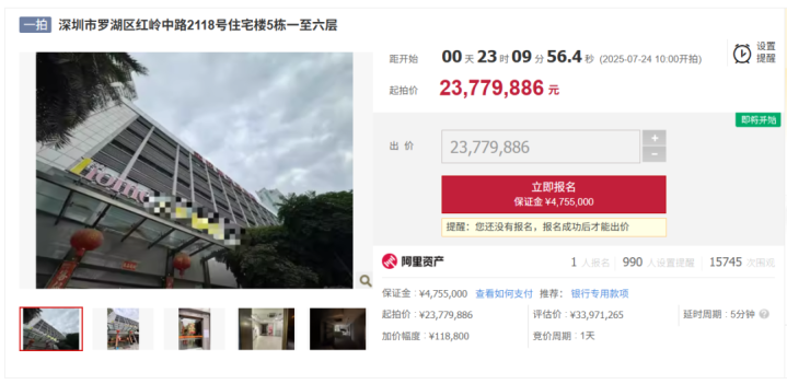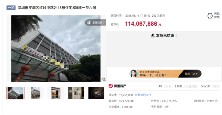 在5月14日,河北邢台一家网红公司率领34名竞拍者血战450轮,最终以1.14亿元、溢价高达380%拿下罗湖区一栋43岁“高龄”的6层老楼。然而6月23日突然悔拍,如此“戏剧性的操作”直接导致,475.5万保证金直接打水漂,网红公司有可能还要面临巨额赔偿。如今标的物重新上架,将在明天(7月24日)约2378万起拍,若成交价达不到1.14亿元,差额需由悔拍的前竞买人支付。这前后创造了泼天的流量话题,不愧是能出1个小目标买写字楼的短视频公司。