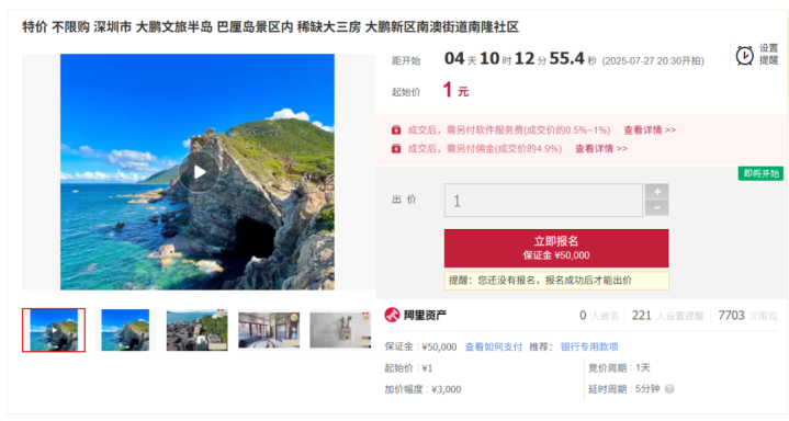 竞拍保证金五万元,加价阶梯为3000元,将在这周日7月27日开拍。